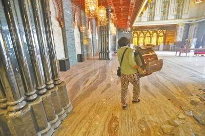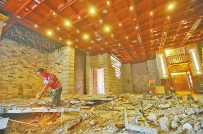 大厅内,金碧辉煌的楼顶和墙体以及各种灯饰等都还没有拆除,大厅东侧的一处1尺高的平台正在拆除。在切割、拉扯、装卸等杂音交响中,东北角一名工人拿着大锤对着室内非承重墙猛砸,已砸出一个大窟窿。很显然,这里正进行大规模拆除。