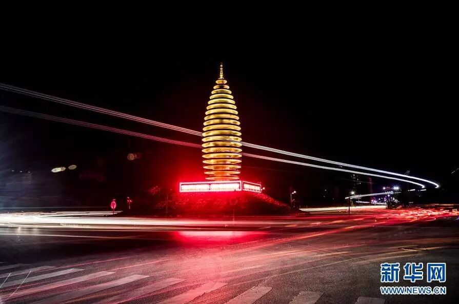 夜幕中容城县地标建筑容和塔,大车车顶灯驶向奥威路后,在夜空留下一道绚丽的光。中国雄安官网记者 王永康 摄