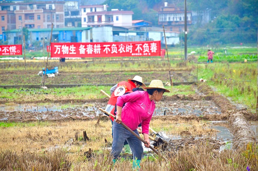 2月13日,广西钦州市浦北县寨圩镇村民在田间劳作。罗婵摄