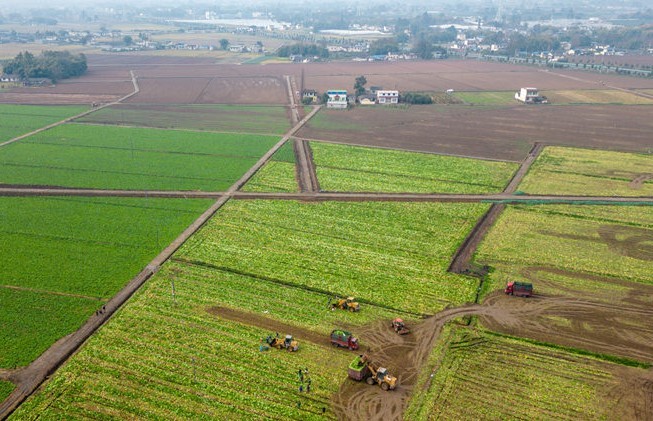 2月9日,四川省眉山市公义镇欣荣村的村民们正用大型机械抢收青菜。翁光建摄