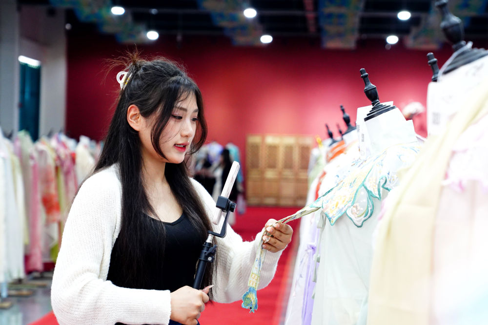 2024年4月13日,主播在山东省菏泽市曹县有爱云仓汉服基地直播推介汉服。新华社记者 郭绪雷 摄
