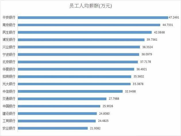 在A股上市的股份制银行中,有16家披露了2015年员工薪酬数据,其中员工薪酬最高的是平安银行,为47万元。