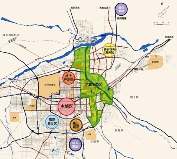 同年,西安在其东北方向启动了渭北工业区建设,分设高陵装备工业组团、阎良航空工业组团、临潼现代工业组团,区位上避开了其市区西面的西咸新区。